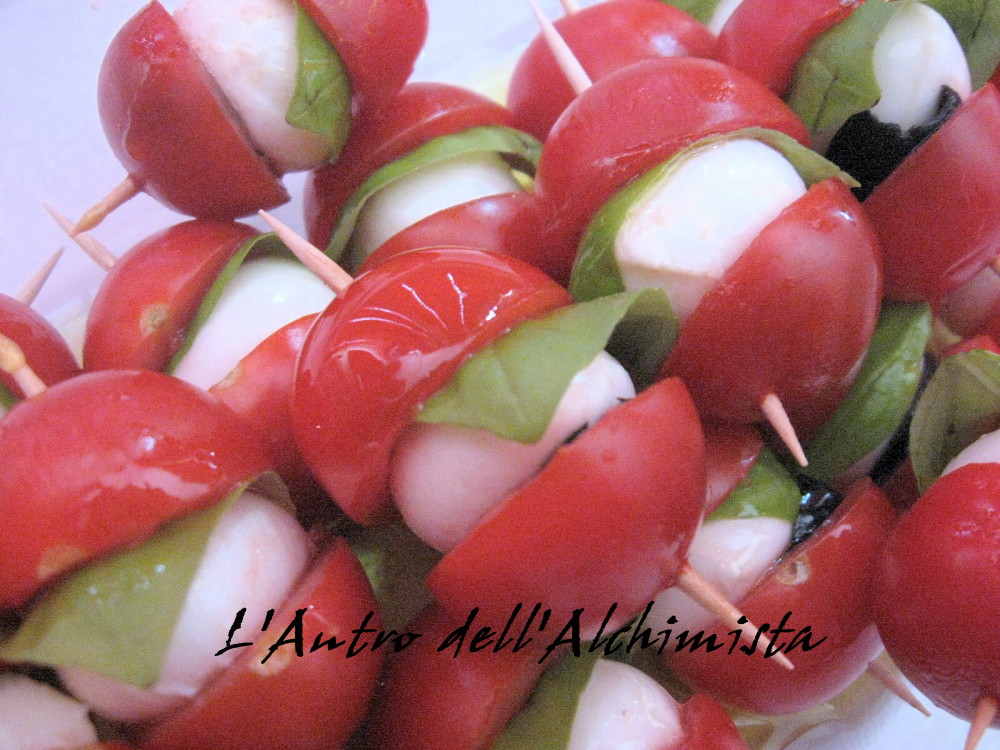 Su uno stecchino alternare: metą pomodorino, all'interno del pomodorino mettere