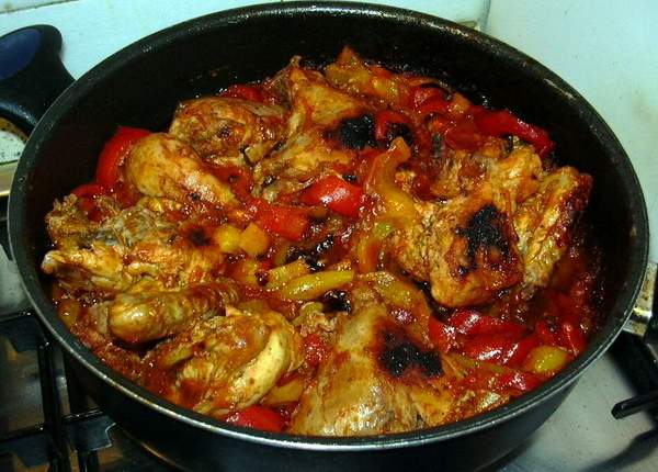 Aggiungere infine il pollo con il suo sughetto e cuocere per 20-30 minuti.